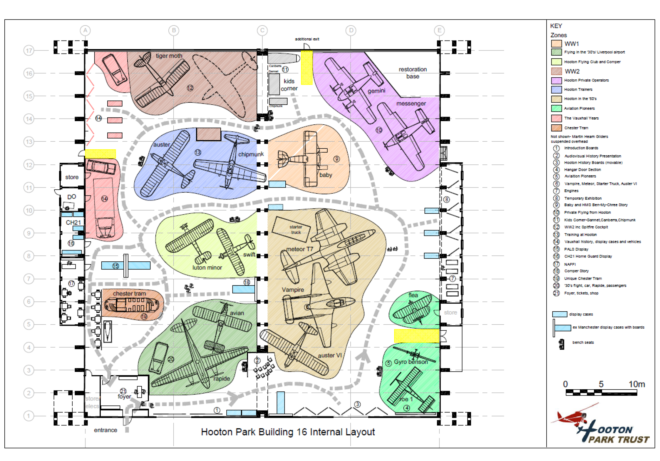 The diagram below shows our plans for Hangar 16, with a new 'one way' system and more exhibits. As you can see, we have reversed the circulation so that the first thing you will see is an orientation wall of history boards and visual presentation. It also allows you to explore the hangar rather than walking down the middle with everything pushed to the sides. We have tried to accommodate everyone without losing sight of the fact that it is a hangar built for aircraft, so our aviation partners The Aeroplane Collection aircraft are displayed with our aviation exhibits. The Griffin Trust have the Vauxhall era covered and have a representative Bedford truck in RAF colours displayed with the jets. There is slack in the layout so that we can accommodate more exhibits as they arrive.